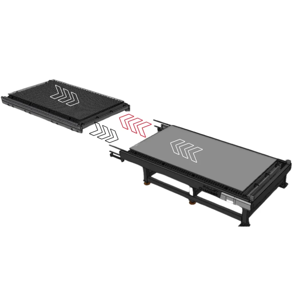 The shuttle table system consists of two moving tables. Cutting process on the table inside the machine sheet can be loaded on the other tray or processed parts can be collected.